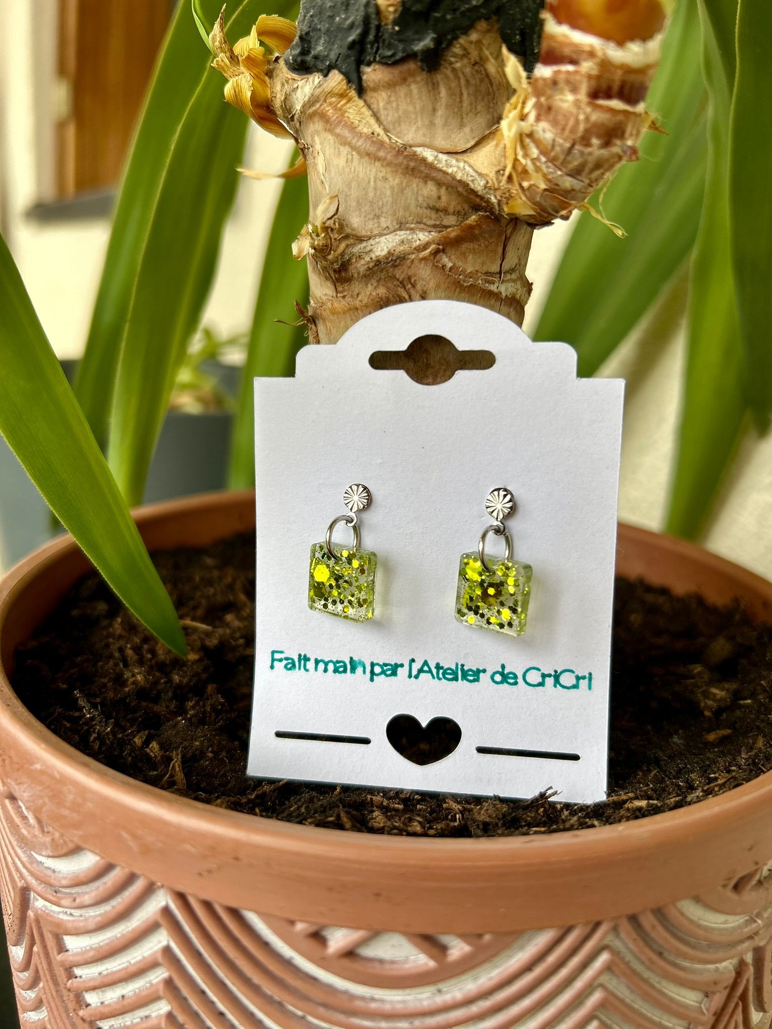 Boucles d'oreilles pendantes carrées, paillettes vertes en résine fait main.